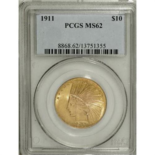 <B>1911 $10 MS62 PCGS.</B></I> PCGS Population (1532/1391). NGC Census: (1864/1645). Mintage: 505,595. Numismedia Wsl. Price for NGC/PCGS coin in MS62: $1,050. (#8868)<BR><BR><B>Coin Engraver:</B> Augustus Saint-Gaudens<BR><BR><b>Shipping:</b> Coins & Currency (<a target="_blank" href="http://www.heritageauctions.com/common/shipping.php">view shipping information</a>)