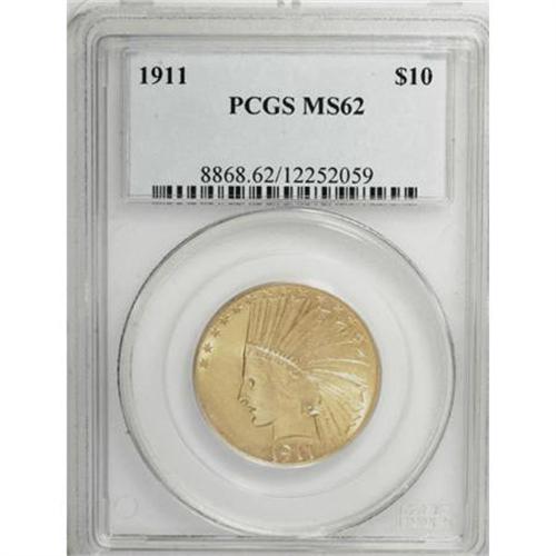 <B>1911 $10 MS62 PCGS.</B></I> The peridot-inflected yellow-gold obverse offers slight contrast with the butter hues of the reverse. Strongly lustrous on each side and well struck with wispy abrasions that preclude Select status.<BR><BR><B>Coin Engraver:</B> Augustus Saint-Gaudens<BR><BR><b>Shipping:</b> Coins & Currency (<a target="_blank" href="http://www.heritageauctions.com/common/shipping.php">view shipping information</a>)