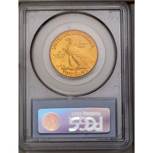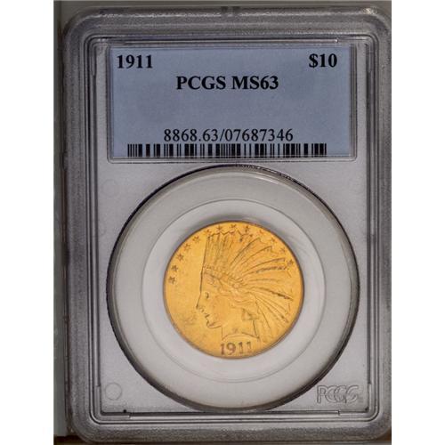 <B>1911<$10> MS63 PCGS.</B></I> Rich apricot-gold surfaces exhibit a somewhat granular texture. The design features are well impressed, including nice definition on the hair over the Indian's ear and on the eagle's wing feathers. A few minor marks on the face and in the left obverse field define the grade.
