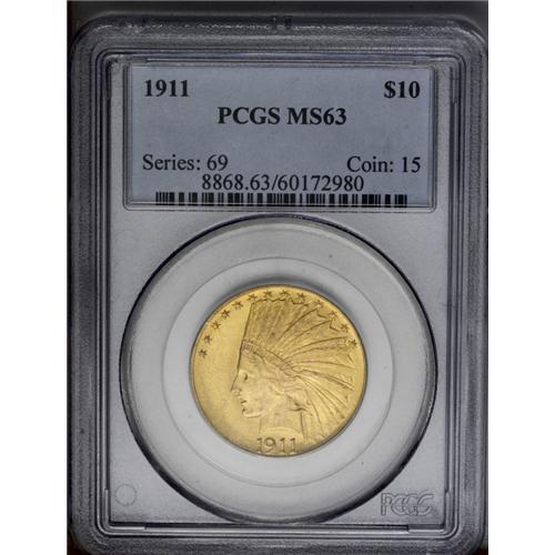 <B>1911<$10> MS63 PCGS.</B></I> Select with lemon-yellow surfaces that show surprisingly few marks for the grade. This well struck piece has plenty of satiny luster in the fields.