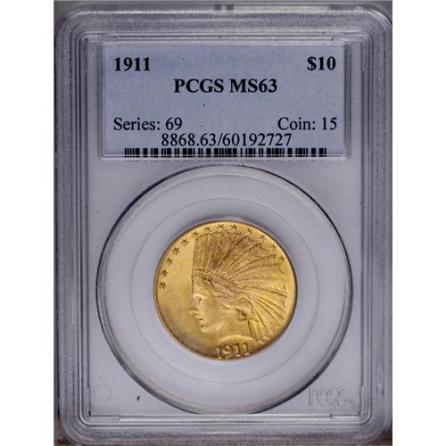 <B>1911<$10> MS63 PCGS.</B></I> The bright apricot-gold surfaces display matte-like textures and rich, full luster. A number of small yet grade-limiting abrasions are noted on the reverse, while the obverse is nearly blemish-free.