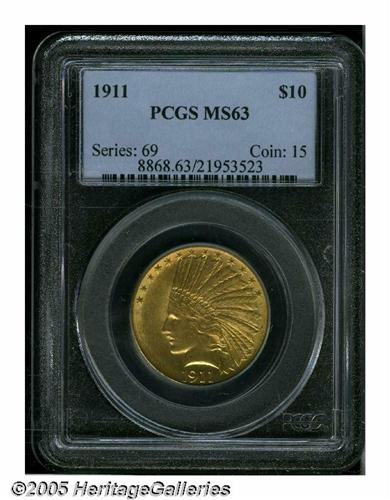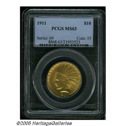 <B>1911<$10> MS63 PCGS.</B></I> This piece features pretty peach-gold patina with light green undertones overlying lustrous surfaces. The design elements are sharply struck. A few minute marks on the Indian's cheek and on the eagle limit the grade.
