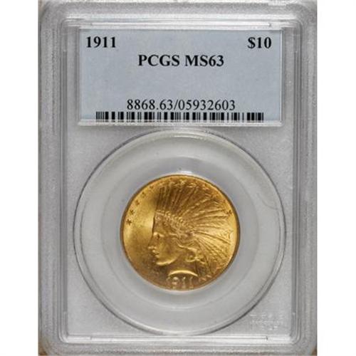 <B>1911 $10 MS63 PCGS.</B></I> This shining Select representative has appealing wheat-gold color on the obverse with slightly richer yellow-gold evident on the reverse. Well-defined with small, scattered abrasions evident on each side. This issue's production of over 500,000 pieces dwarfs that of its branch-mint cousins.<BR><BR><b>Shipping:</b> Coins & Currency (<a target="_blank" href="http://www.heritageauctions.com/common/shipping.php">view shipping information</a>)