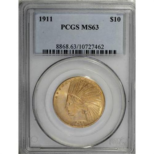<B>1911 $10 MS63 PCGS.</B></I> . PCGS Population (992/472). NGC Census: (962/731). Mintage: 505,595. Numismedia Wsl. Price for NGC/PCGS coin in MS63: $2,100. (#8868)<BR><BR><B>Coin Engraver:</B> Augustus Saint-Gaudens<BR><BR><b>Shipping:</b> Coins & Currency (<a target="_blank" href="http://www.heritageauctions.com/common/shipping.php">view shipping information</a>)