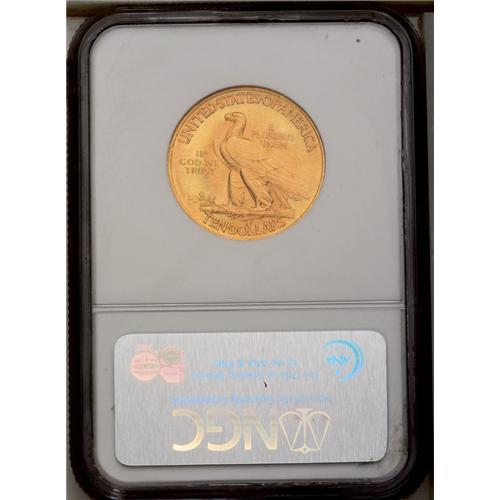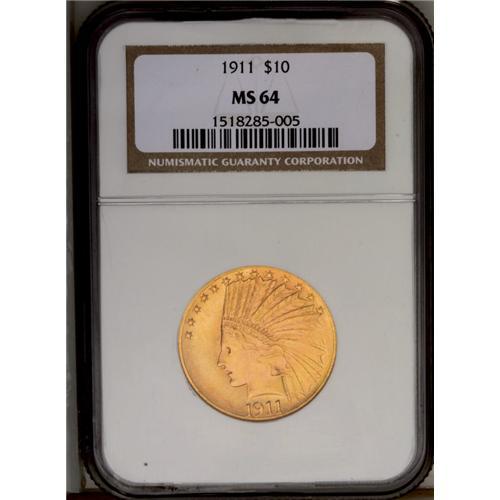 <B>1911<$10> MS64 NGC.</B></I> A few light abrasions on each side limit a Gem grade, but the overall eye appeal is high. The satiny surfaces have a fine-grained, matte-like appearance, and both sides have a lovely two-toned appearance, with reddish-gold ceding to tinges of hazel in the fields.