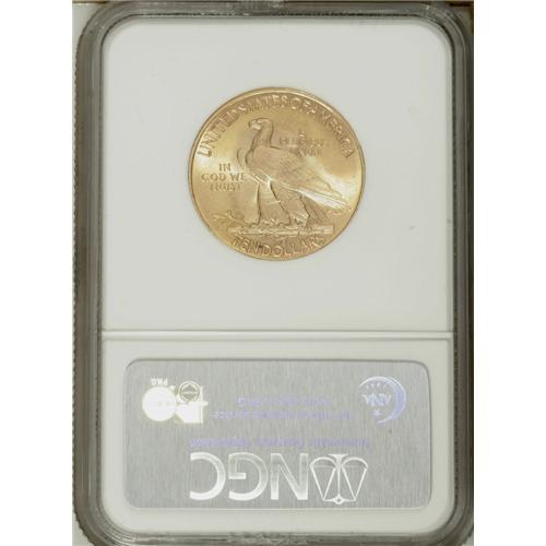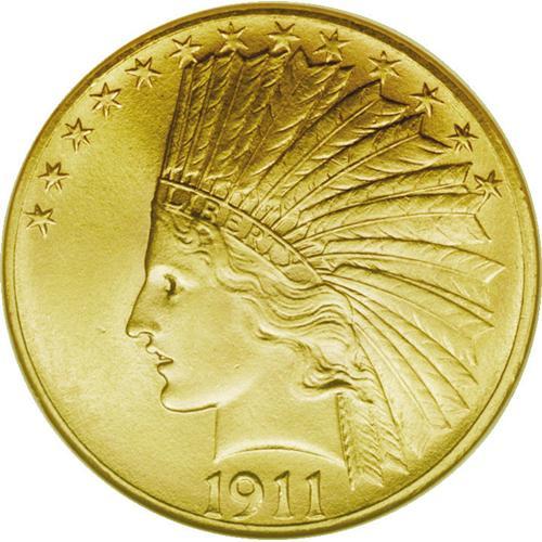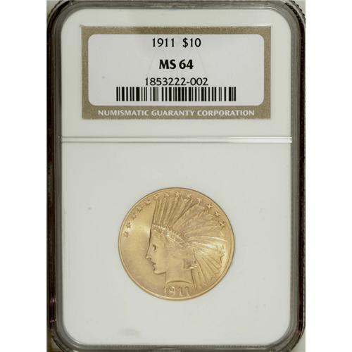 <B>1911 $10 MS64 NGC.</B></I> This lustrous near-Gem ten dollar has a somewhat grainy finish, which is quite pleasing, and attractive brass-gold patination. The design features are well brought up, especially on the Indian's hair and headdress feathers. Nice definition is also apparent on the eagle's plumage. Close examination reveals fewer marks than what might be expected for the grade designation.<BR><BR><b>Shipping:</b> Coin/Currency (<a target="_blank" href="http://www.heritageauctions.com/common/shipping.php">view shipping information</a>)
