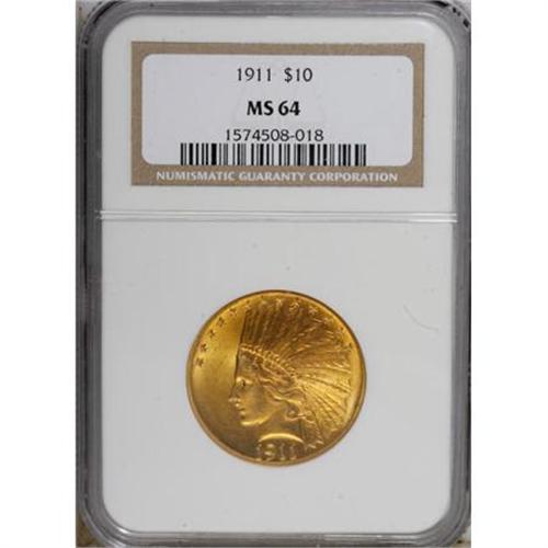 <B>1911 $10 MS64 NGC.</B></I> Rich and attractive orange-gold surfaces create exceptional eye appeal for this sharply struck near-Gem specimen. A few trivial surface marks have prevented a higher grade. The 1911 eagle is considered one of the common issues in the Indian series, but it is still elusive in Gem condition, and Choice pieces are in strong demand. This piece displays great technical quality and eye appeal.<BR><BR><b>Shipping:</b> Coins & Currency (<a target="_blank" href="http://www.heritageauctions.com/common/shipping.php">view shipping information</a>)