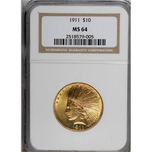 <B>1911 $10 MS64 NGC.</B></I> The light yellow-gold surfaces of this near-Gem display uncommonly vibrant luster, and the overall level of detail is above-average for the issue. A pleasing survivor from an issue of just over half a million pieces. MS64 Indian gold has been a market leader over the past five years.<BR><BR><B>Coin Engraver:</B> Augustus Saint-Gaudens<BR><BR><b>Shipping:</b> Coins & Currency (<a target="_blank" href="http://www.heritageauctions.com/common/shipping.php">view shipping information</a>)