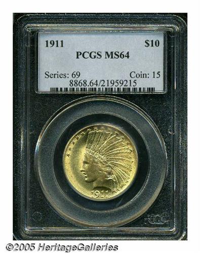 <B>1911<$10> MS64 PCGS.</B></I> Dazzling luster embraces each side of this flashy yellow-gold specimen, whose surfaces exude the finely granular, frosty appearance typical of this issue. The design elements are sharply struck, and the surfaces are impeccably well preserved. A couple of minute marks near the Indian's eye and on the cheek are all that keeps this lovely specimen from Full Gem.