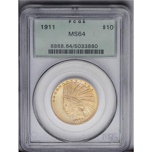 <B>1911<$10> MS64 PCGS.</B></I> Rich peach and green-gold tones endow this fully lustrous and nearly unmarked representative. Sharply struck on the olive branch, claws, and arrows bundle. An excellent choice for a quality gold type set. Encapsulated in a green label holder. <BR><BR><B>Important notice:</B> Heritage usually auctions material at the rate of 200-250 lots per hour. On some occasions eBay Live bid software or the Internet may not be able to keep up with the pace of the auction. We recommend placing a realistic absentee bid now as insurance to avoid disappointment. Occasionally the auctioneer may eliminate or reject an eBay Live bid, and the auctioneer may also reopen a lot after the close of the eBay live bidding (usually because we missed an audience bid), and may reject your bid even if it shows you as the winning bidder. By bidding via eBay Live, you agree that Heritage may award the lot to another bidder at its sole discretion under the circumstances described above or any other reasonable circumstances. Since eBay bids are not shown to us until we open the lot on the floor, we treat those bids just like floor bids. In most cases the floor responds before the eBay bid is presented to us, due to Internet lag time, so for consistency we have made it a policy that floor bids are always considered first over tie eBay live bids. Also please note that all Heritage lots purchased through eBay Live carry a 20% Buyer's Premium. Please make sure you read the Terms and Conditions before you bid. This lot is being auctioned in conjunction with a live floor auction by Heritage Galleries & Auctioneers. All final auction and invoice information will be supplied by Heritage Galleries & Auctioneers, and all other information should be considered preliminary. Lot:4128 <BR><BR><B>Winning Notification and Billing:</B> After the FINAL session in this auction is complete, Heritage will send e-mail and snail mail invoices. This process normally takes several days. All final auction and invoice information will be supplied by Heritage Galleries & Auctioneers, and all other information should be considered preliminary. <BR><BR>This auction will be conducted on a live auction floor and over the Internet through eBay Live. If you choose to place an absentee bid, please take a moment to <font color='#0000ff'><u><a href='http://pages.ebay.com/liveauctions/help/before/laabsentee.html'>learn how eBay Live absentee bidding works</a></u></font><font color='#000000'>