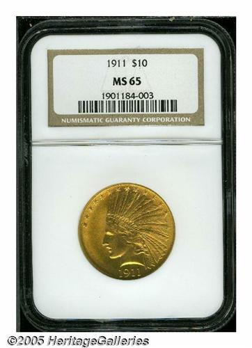 <B>1911<$10> MS65 NGC.</B></I> Extremely lustrous with peerless fields and lovely lilac and pale orange highlights. While not considered a scarcer issue within the series of Indian Eagles, its importance as a Gem far outweighs any and all other factors. Population: 108 in 65, 41 finer (5/05).