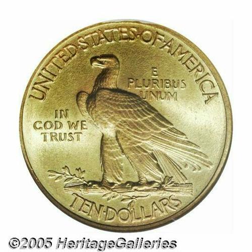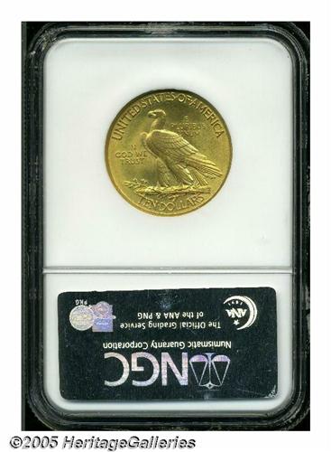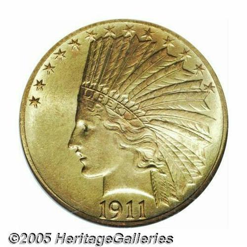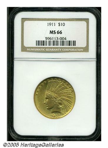 <B>1911<$10> MS66 NGC.</B></I> Both sides of this impeccable satin-like example display a pleasing mixture of green-gold alloy and pale orange highlights that punctuate the originality of this important type coin. Premium Gem representatives of this unique, always popular gold design are seldom encountered regardless of date or mintmark. Population: 30 in 66, 11 finer (5/05).