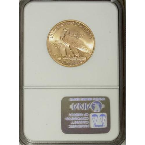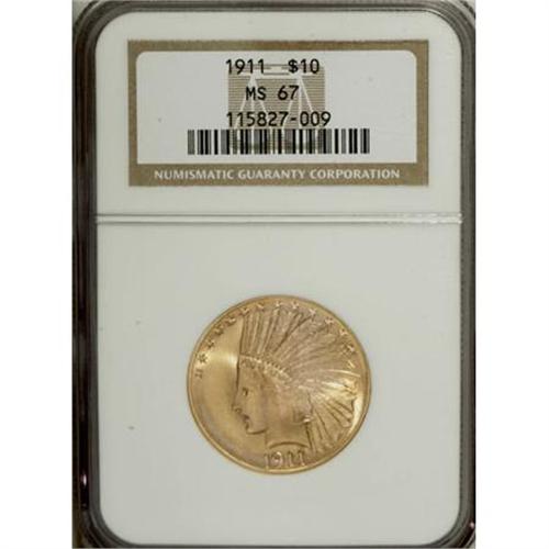 <B>1911 $10 MS67 NGC.</B></I> The 1911 Indian eagle has a relatively high mintage of 505,500 business strikes, and is one of the more available dates in the series, especially in grades of Very Fine to near-Gem. Gems are scarce, however, with fewer than 200 examples certified by NGC and PCGS combined. MS66 specimens account for about 70 pieces, and there are fewer than 20 Superb Gems certified. These figures are probably somewhat inflated when one takes resubmissions into account.<BR> On this Superb Gem, bright luster exudes from typically seen finely granular, frosty surfaces that possess a yellow-gold hue with traces of apricot. The design features saw a well impressed strike, as excellent definition shows in the Indian's hair and bonnet feathers and on most of the eagle's plumage. Both faces of this coin are remarkably well preserved. The only pedigree marks we can locate are some faint handling marks on the Indian's cheekbone. Census: 7 in 67, 2 finer (6/07).<BR><I>From The Belle Glade Collection, Part Two.</B></I><BR><BR><B>Coin Engraver:</B> Augustus Saint-Gaudens<BR><BR><b>Shipping:</b> Coins & Currency (<a target="_blank" href="http://www.heritageauctions.com/common/shipping.php">view shipping information</a>\)