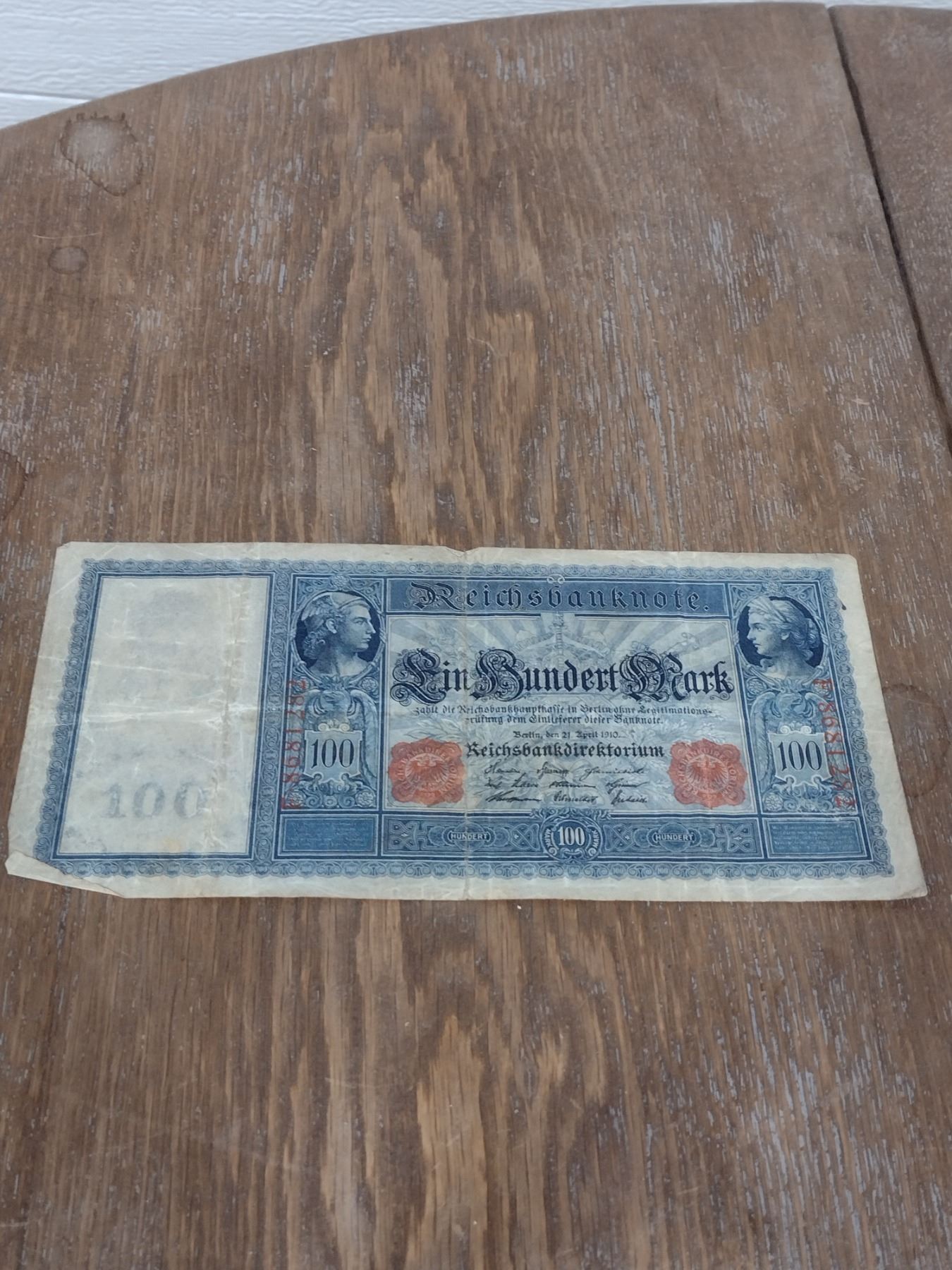 This is a 100 Mark banknote issued by the Reichsbank, dated April 21, 1910. The Reichsbank was the central bank of the German Empire,
