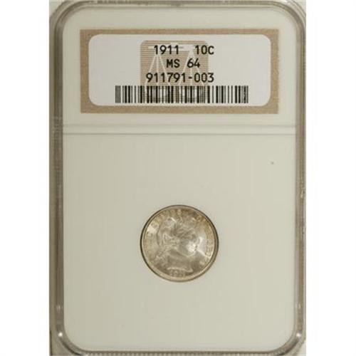 <B>1911 10C MS64 NGC.</B></I> NGC Census: (215/171). PCGS Population (208/182). Mintage: 18,870,544. Numismedia Wsl. Price for NGC/PCGS coin in MS64: $252. (#4857)<BR><BR><b>Shipping:</b> Coins & Currency (<a target="_blank" href="http://www.heritageauctions.com/common/shipping.php">view shipping information</a>)