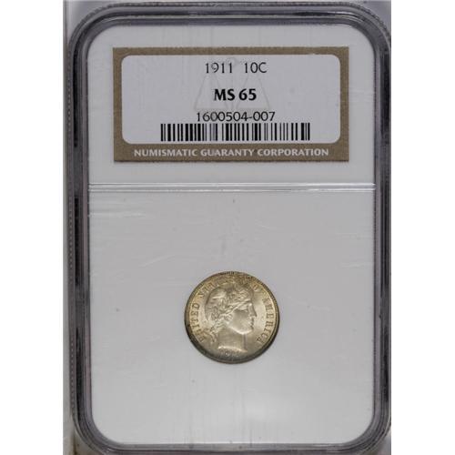 <B>1911<10C> MS65 NGC.</B></I> A lovely and well struck Gem that has flashy luster and freckles of light tan-gold patina. A few light handling marks are noted on each side.