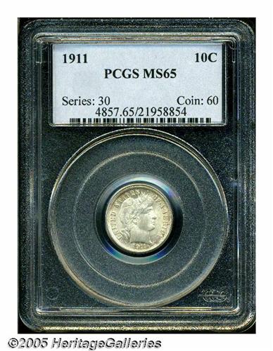 <B>1911<10C> MS65 PCGS.</B></I> A pinpoint-sharp piece that exhibits potent luster and faint olive-gold color. The reverse is essentially immaculate, and the portrait only has the faintest grazes.
