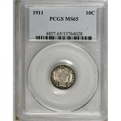 <B>1911 10C MS65 PCGS.</B></I> Decisively struck with delightful, satiny luster. This later Barber Gem offers silver-gray centers with charcoal and olive-gold patina at the obverse margins. The reverse periphery shows hints of similar toning.<BR><BR><B>Coin Engraver:</B> Charles E. Barber<BR><BR><b>Shipping:</b> Coins & Currency (<a target="_blank" href="http://www.heritageauctions.com/common/shipping.php">view shipping information</a>)