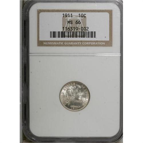 <B>1911 10C MS66 NGC.</B></I> A lustrous, fully brilliant example that is ideal for a Gem type or date set. The surfaces are free of any noticeable abrasions and the strike is razor-sharp. Census: 44 in 66, 13 finer (9/07).<BR><BR><B>Coin Engraver:</B> Charles E. Barber<BR><BR><b>Shipping:</b> Coins & Currency (<a target="_blank" href="http://www.heritageauctions.com/common/shipping.php">view shipping information</a>)
