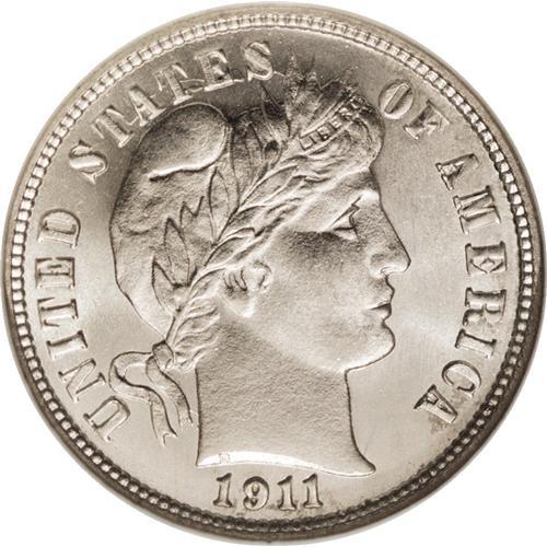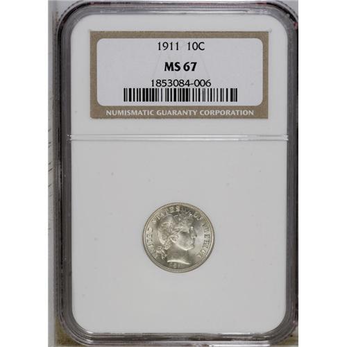 <B>1911 10C MS67 NGC.</B></I> Blazing luster is comprehensive across this faintly toned and pinpoint-sharp Superb Gem. The fields are gloriously smooth, with the only interruption in the form of a clash mark on STATES from the base of the wreath. The 1911 is among the more available dates within the Barber series, but is rarely seen in such remarkable quality. Census: 10 in 67, 2 finer (10/06).<BR><BR><b>Shipping:</b> Coin/Currency (<a target="_blank" href="http://www.heritageauctions.com/common/shipping.php">view shipping information</a>)