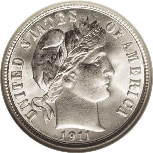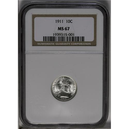 <B>1911<10C> MS67 NGC.</B></I> Essentially mark-free and possessed of thick, snow-white frost, this example is a beautiful, although affordable, representation of Charles E. Barber's dime. Boldly defined and uninhibited by even the palest patina, this coin's memorable qualities rise through the holder with blinding intensity. Census: 10 in 67, 2 finer (6/06).