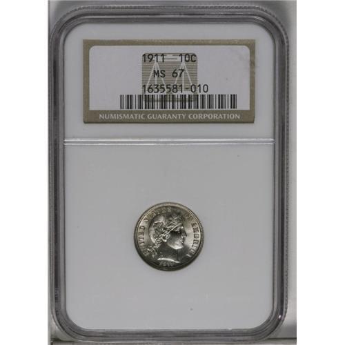 <B>1911<10C> MS67 NGC.</B></I> This beautiful high grade Barber dime features booming luster and attractive preservation. Wisps of gold deny full brilliance. The 1911 trades as a type coin, and is available in middle Mint State grades, but is conditionally rare as a Superb Gem. Census: 10 in 67, 2 finer (6/06).<BR><I>From The Chief Paduke Collection.</B></I>
