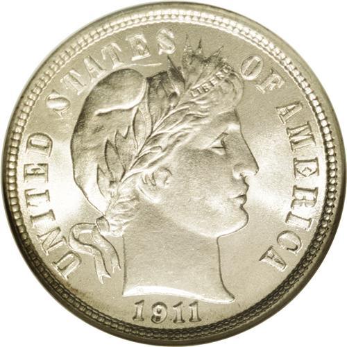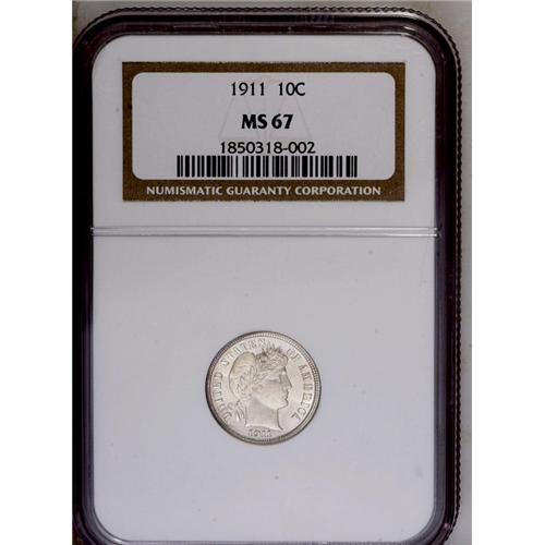 <B>1911<10C> MS67 NGC.</B></I> This is a common date that will appeal to both the date collector and the type collector. A frosty and highly lustrous Superb Gem Barber dime with faint traces of champagne toning over bright silver color. Both sides have a sharp strike with essentially full design details. Tied for the finest example certified by NGC. Census: 8 in 67, 0 finer (6/06).