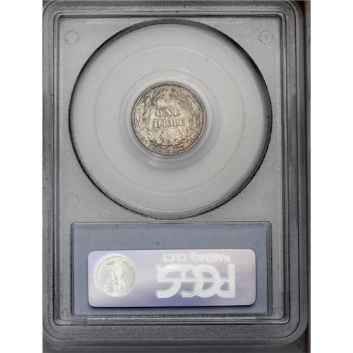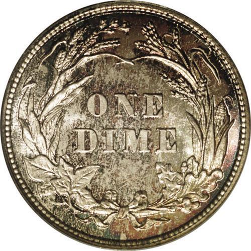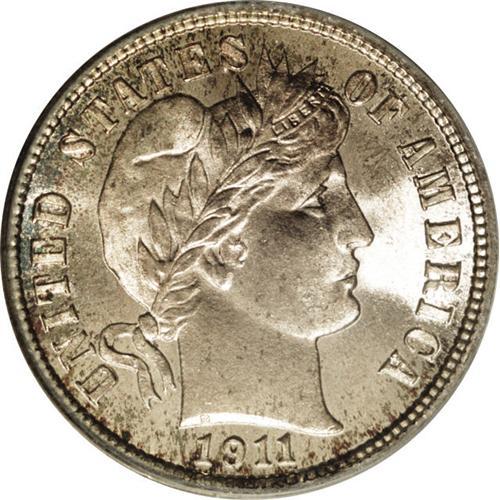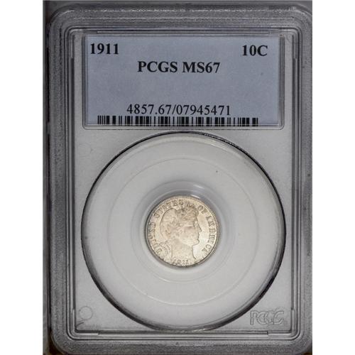 <B>1911<10C> MS67 PCGS.</B></I> A stunning Superb Gem example with frosty silver luster on both sides. The obverse is mostly brilliant with splashes of russet and blue color, and the reverse exhibits speckled iridescent toning. Few examples of this date can equal this coin for overall quality and eye appeal. Population: 10 in 67, 2 finer (3/06).