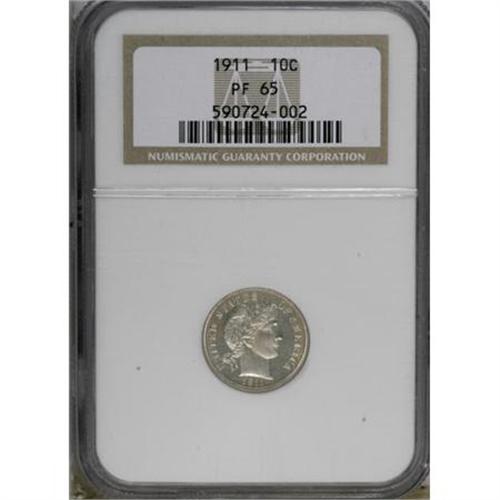 <B>1911 10C PR65 NGC.</B></I> By 1911, collectors were largely disenchanted with the Barber design, and the proof dime issue for the year amounted to just 543 specimens. This Gem has strong reflectivity, traces of golden patina at the margins, and surprisingly heavy contrast for a piece not awarded the Cameo designation. Census: 48 in 65, 47 finer (1/08).<BR><BR><B>Coin Engraver:</B> Charles E. Barber<BR><BR><b>Shipping:</b> Coins & Currency (<a target="_blank" href="http://www.heritageauctions.com/common/shipping.php">view shipping information</a>)