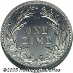 <B>1911 10C PR67 NGC.</B></I> Only 656 proofs were struck of this date and nowhere near enough survive today to satisfy the demands of high grade type collectors. This is a deeply mirrored example that has rich cobalt-blue and gray toning on the obverse, while the reverse is several shades lighter in color and shows even more of the flashy proof fields. Only one contact mark is mentionable, an angling abrasion on the cheek of Liberty. Population: 17 in 67, 7 finer (2/05).