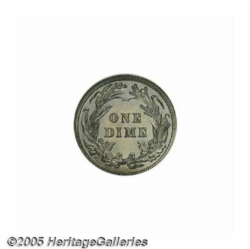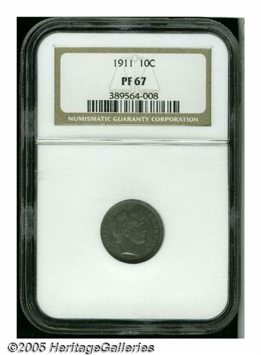 <B>1911<10C> PR67 NGC.</B></I> Only 656 proofs were struck of this date and nowhere near enough survive today to satisfy the demands of high grade type collectors. This is a deeply mirrored example that has rich cobalt-blue and gray toning on the obverse, while the reverse is several shades lighter in color and shows even more of the flashy proof fields. Only one contact mark is mentionable, an angling abrasion on the cheek of Liberty. Population: 17 in 67, 7 finer (6/05).