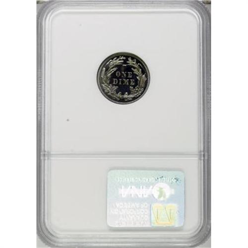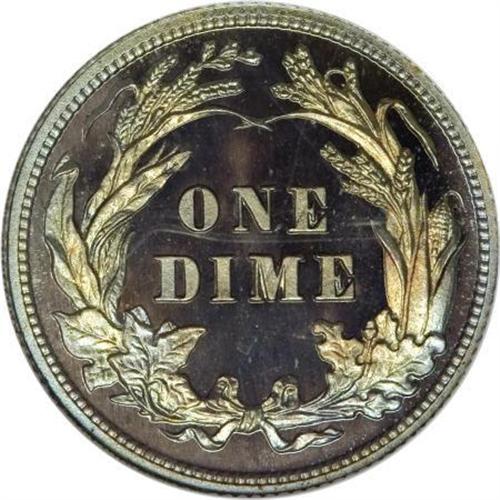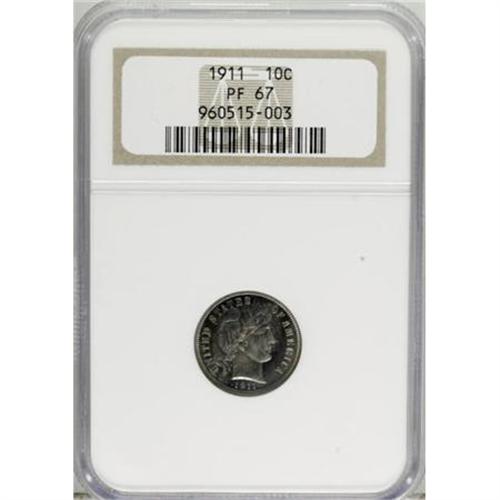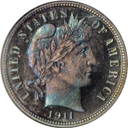 <B>1911 10C PR67 NGC.</B></I> Vivacious powder-blue, plum-mauve, and caramel-gold alternate across this flashy and fully struck Superb Gem. The obverse center has the deepest toning, although mint frost is still apparent on the portrait. Thorough evaluation beneath a loupe cannot locate any hairlines or other surface detractions. A scant 543 proofs were struck. Census: 16 in 67, 7 finer (6/07).<BR><BR><B>Coin Engraver:</B> Charles E. Barber<BR><BR><b>Shipping:</b> Coins & Currency (<a target="_blank" href="http://www.heritageauctions.com/common/shipping.php">view shipping information</a>\)