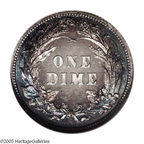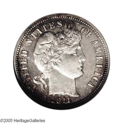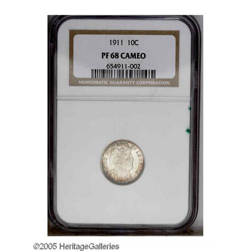<B>1911<10C> PR68 Cameo NGC.</B></I> Similar to the coin we sold in our 2005 Central States Auction, this piece is also brilliant in the center with peripheral toning. The devices are noticeably frosted with strongly mirrored fields. The marginal toning is golden-brown with the occasional dab of thalo-blue interspersed. Only 656 proofs were struck, this piece sits at the pinnacle of perfection with only three other pieces so graded and none finer (10/05).
