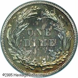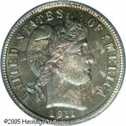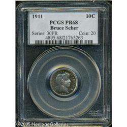 <B>1911 10C PR68 PCGS.</B></I> Sky-blue, lavender, and gold colors alternate across the obverse, while the reverse displays iridescent electric-blue centers framed by rich apricot and golden-brown hues. Not merely a treat for the eyes, this exceptional piece is fully struck and magnificently preserved. A scant 656 pieces were struck, and given the growth of Registry Set collecting, insufficient numbers survive in high grades. Population: 6 in 68, none finer (1/05).<BR><I>From the Bruce Scher #1 All-Time PCGS Registry Set.</B></I> Lot:4071