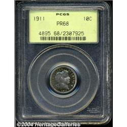 <table><tbody><tr><td><table> <TR><TD width="100%"><TABLE cellSpacing=1 cellPadding=3 width="100%" border=0><TBODY><TR><TD width="100%" bgColor=#79735c><FONT face=arial color=#ffffff size=3><B>Description</B> </FONT></TD></TR><TR><TD width="100%" bgColor=#ffffff><FONT face=arial size=2><B>1911 10C PR68 PCGS.</B></I> Deep turquoise-blue and crimson-magenta tones amply decorate each side. In addition, an antique-golden peripheral ring borders the reverse. The immaculate surfaces reflect no mentionable marks, spots, or distractions. One of the finest, fully original examples we have ever seen. Population: 7 in 68, none finer at either service (10/03). </FONT></TD></TR></TBODY></TABLE></TD></TR></TBODY></TABLE><BR><A name=PricesRealized></A><TABLE cellSpacing=0 cellPadding=0 width="100%" bgColor=#000000 border=0><TBODY><TR><TD width="100%"><TABLE cellSpacing=1 cellPadding=3 width="100%" border=0><TBODY><TR><TD width="100%" bgColor=#79735c><A name=PR><FONT face=arial color=#ffffff size=3><B>Previous Prices from Heritage Auctions</B> </FONT></A></TD></TR><TR><TD bgColor=#f6f6ed>No Prior Data Recorded </TD></TR><TR><TD bgColor=#ffffff><FONT face=arial size=1 ?>PLEASE NOTE: All prices realized reflect the final hammer price PLUS the buyer's premium in auctions that charge a buyer's premium. Each item has a notation at the top of the listing indicating whether that lot included a buyer's premium. Example: A item that sells with a final hammer price of $100 and a 20% buyer's premium will display with a price realized of $120. All information listed is intended to be as accurate as possible, but errors are possible. Please use this guide carefully and inform us of any inaccuracies. </FONT></TD></TR></TBODY></TABLE></TD></TR></TBODY></TABLE><BR><TABLE cellSpacing=0 cellPadding=0 width="100%" bgColor=#000000 border=0><TBODY><TR><TD width="100%"><TABLE cellSpacing=1 cellPadding=3 width="100%" border=0><TBODY><TR><TD width="100%" bgColor=#79735c colSpan=6><FONT face=arial color=#ffffff size=3><B>Price Guide*</B> </FONT></TD></TR><TR bgColor=#f6f6ed><TD align=middle><B>Grade</B> </TD><TD align=middle><B>Coin World<BR>(Trends)</B> </TD><TD align=middle><B>Numismedia<BR>Retail</B> </TD><TD align=middle><B>Numismedia<BR>Wholesale</B> </TD><TD align=middle><B>Coin<BR>Universe</B> </TD><TD align=middle><B>Heritage<BR>Value Index</B> </TD></TR><TR bgColor=#ffffff><TD align=middle>67</TD><TD align=right>---</TD><TD align=right>---</TD><TD align=right>$2,975.00</TD><TD align=right>$4,600.00</TD><TD align=right>$2,910.00</TD></TR><TR style="FONT-WEIGHT: bold" bgColor=#cccfdd><TD align=middle>68</TD><TD align=right>---</TD><TD align=right>---</TD><TD align=right>---</TD><TD align=right>---</TD><TD align=right>---</TD></TR><TR bgColor=#ffffff><TD align=middle>69</TD><TD align=right>---</TD><TD align=right>---</TD><TD align=right>---</TD><TD align=right>---</TD><TD align=right>---</TD></TR><TR bgColor=#ffffff><TD colSpan=6><FONT size=1>*All information listed is intended to be as accurate as possible, but errors are possible. No item may be returned or refused based on this information which is provided as a service to our customers. You should contact each pricing source directly to determine the accuracy of this information. </FONT></TD></TR></TBODY></TABLE></TD></TR></TBODY></TABLE><BR><TABLE cellSpacing=0 cellPadding=0 width="100%" bgColor=#000000 border=0><TBODY><TR><TD width="100%"><TABLE cellSpacing=1 cellPadding=3 width="100%" border=0><TBODY><TR><TD width="100%" bgColor=#79735c><FONT face=arial color=#ffffff size=3><B>Population Guide</B> </FONT></TD></TR><TR bgColor=#ffffff><TD align=middle><!-- Begin Output of Population Grid--><TABLE cellSpacing=0 cellPadding=0 width="100%" border=0><TBODY><TR><TD vAlign=center><TABLE cellSpacing=0 width="100%" border=1 cellsadding="3"><TBODY><TR><TD vAlign=center><TABLE cellSpacing=0 cellPadding=3 width="100%" border=1><TBODY><TR><TD vAlign=center align=middle bgColor=#f0f1e8 colSpan=2 <CENTER><FONT face=Arial size=2><B>PCGS Pop </B></FONT><CENTER></CENTER></TD><TD vAlign=center align=middle bgColor=#f0f1e8 colSpan=2><CENTER><FONT face=Arial size=2><B>NGC Pop</B></CENTER></FONT></TD></TR><TR><TD vAlign=center><FONT face=Arial size=2>(68)</FONT> </TD><TD vAlign=center align=right><FONT face=Arial size=2>7</FONT> </TD><TD vAlign=center><FONT face=Arial size=2>(68)</FONT> </TD><TD vAlign=center align=right><FONT face=Arial size=2>9</FONT> </TD></TR><TR><TD vAlign=center><FONT face=Arial size=2>(>68)</FONT> </TD><TD vAlign=center align=right><FONT face=Arial size=2>0</FONT> </TD><TD vAlign=center><FONT face=Arial size=2>(>68)</FONT> </TD><TD vAlign=center align=right><FONT face=Arial size=2>0</FONT> </TD></TR></TBODY></TABLE></TD></TR></TBODY></TABLE></TD></TR></TBODY></TABLE><!-- End Output of Population Grid--></TD></TR></TBODY></TABLE></TD></TR></TBODY></TABLE><BR><TABLE cellSpacing=0 cellPadding=0 width="100%" bgColor=#000000 border=0><TBODY><TR> <font color='#000000'><span style='background-color: #FFFFFF'><td bgcolor='#FFFFFE'> Important notice: Heritage usually auctions material at the rate of 200-250 lots per hour. On some occasions eBay Live bid software or the Internet may not be able to keep up with the pace of the auction. We recommend placing a realistic absentee bid now as insurance to avoid disappointment. Occasionally the auctioneer may eliminate or reject an eBay Live bid, and the auctioneer may also reopen a lot after the close of the eBay live bidding (usually because we missed an audience bid), and may reject your bid even if it shows you as the winning bidder. By bidding via eBay Live, you agree that Heritage may award the lot to another bidder at its sole discretion under the circumstances described above or any other reasonable circumstances. Since eBay bids are not shown to us until we open the lot on the floor, we treat those bids just like floor bids. In most cases the floor responds before the eBay bid is presented to us, due to Internet lag time