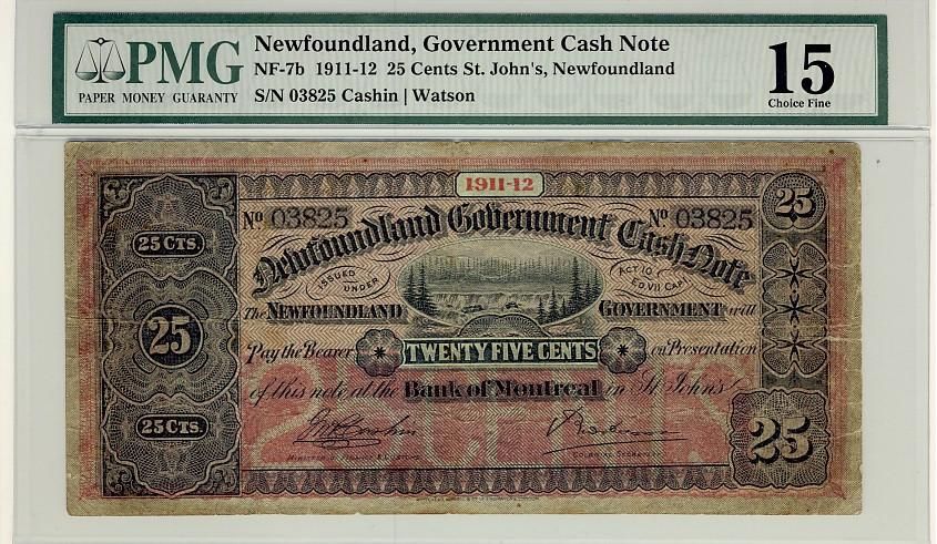 1911-12 25¢ NF-7b Nfld Gov note #03825, PMG F15
