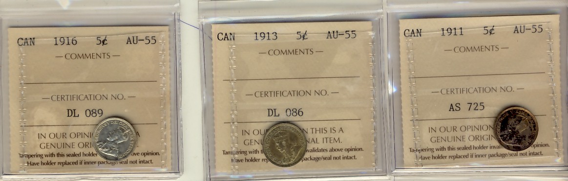 1911, 1913 & 1916 5¢ ICCS AU55. Lot of 3 coins.