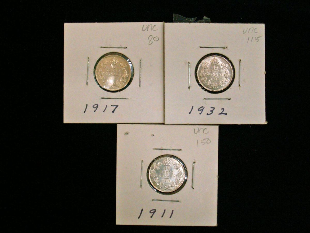 1911, 1917 & 1932 10¢. Lot of 3 coins all MS60.
