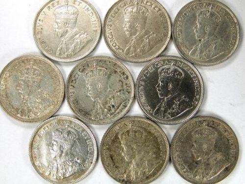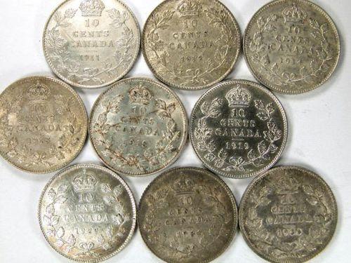 Canada Ten Cents 1911, 1912, 1914, 1918 two pieces, 1919, 1929, 1931 and 1936. Nine pale to lightly toned pieces, all EF