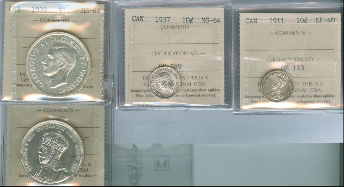 1911 & 1937 10¢ ICCS EF40. Lot of 4 coins including 1911 10¢ EF40, 1937 10¢ MS64, 1935 $1 EF45 and 1939 $1 MS62. All coins graded ICCS.