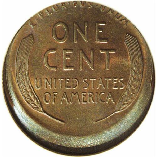 <B>1911<1C> Lincoln Cent--Broadstruck--MS65 Brown NGC.</B></I> An uncentered broadstrike whose band of unstruck surface is widest at 1 o'clock. The absence of a collar die to restrain metal flow gives IN GOD WE TRUST and E PLURIBUS UNUM a blurry, distorted appearance, although both legends are fully legible. A lustrous ocean-blue and orange-brown Gem, clean save for a horizontal hair-thin mark near the forehead.