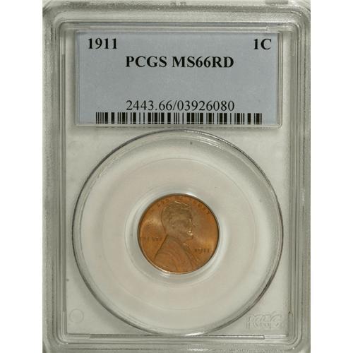 <B>1911 1C MS66 Red PCGS.</B></I> A fire-red piece that has a glimpse of pale gold on the portrait. Mark-free and highly lustrous with infrequent and nearly microscopic carbon. Population: 73 in 66 Red, 8 finer (2/07).<BR><BR><b>Shipping:</b> Coins & Currency (<a target="_blank" href="http://www.heritageauctions.com/common/shipping.php">view shipping information</a>)