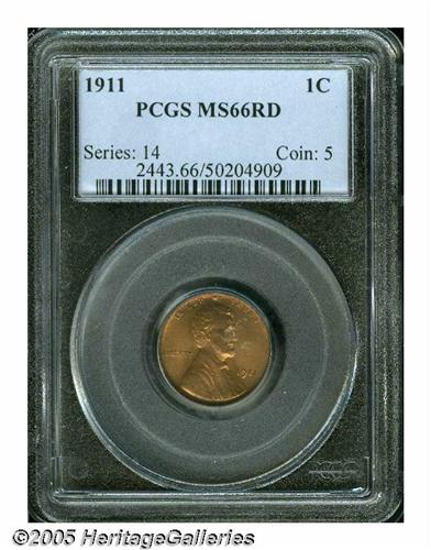 <B>1911<1C> MS66 Red PCGS.</B></I> Coppery-red surfaces exhibit nice underlying luster, some light muting on the reverse, and a couple of faint toning spots. The design elements are nicely struck up. Population: 63 in 66, 8 finer (5/05).