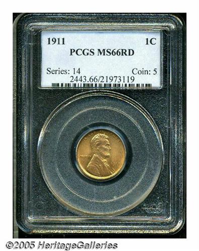 <B>1911<1C> MS66 Red PCGS.</B></I> This radiant apricot-gold premium Gem is intricately struck and highly lustrous. A trace of obverse carbon precludes an even higher grade. Population: 67 in 66, 8 finer (5/05).