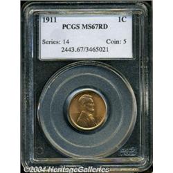 <B>1911<1C> MS67 Red PCGS.</B></I> The 1911 P-mint issue is readily available in all grades, including Gem Mint State. As indicated by population reports, however, the number of 1911-P cents certified at the MS67 Red level or above drops significantly from that of the MS66 Red designation. Likewise, our own auction records reveal no 1911-P appearances at the MS67 Red level in our auction sales since at least 1995. The coin in the present lot, therefore, represents a real opportunity for advanced Lincoln cent collectors. This gorgeous piece possesses bright orange color with golden-yellow undertones. The design features are sharply struck, with excellent detail showing in Lincoln's hair, beard, and bow tie, and on the wheat stalks. The pristine surfaces are virtually free of any mentionable abrasions or carbon spots. Population: 7 in 67, 1 finer (7/04). <BR><BR><B>Important notice:</B> Heritage usually auctions material at the rate of 200-250 lots per hour. On some occasions eBay Live bid software or the Internet may not be able to keep up with the pace of the auction. We recommend placing a realistic absentee bid now as insurance to avoid disappointment. Occasionally the auctioneer may eliminate or reject an eBay Live bid, and the auctioneer may also reopen a lot after the close of the eBay live bidding (usually because we missed an audience bid), and may reject your bid even if it shows you as the winning bidder. By bidding via eBay Live, you agree that Heritage may award the lot to another bidder at its sole discretion under the circumstances described above or any other reasonable circumstances. Since eBay bids are not shown to us until we open the lot on the floor, we treat those bids just like floor bids. In most cases the floor responds before the eBay bid is presented to us, due to Internet lag time, so for consistency we have made it a policy that floor bids are always considered first over tie eBay live bids. Also please note that all Heritage lots purchased through eBay Live carry a 20% Buyer's Premium. Please make sure you read the Terms and Conditions before you bid. </span></font></tr></table></td></tr></table>