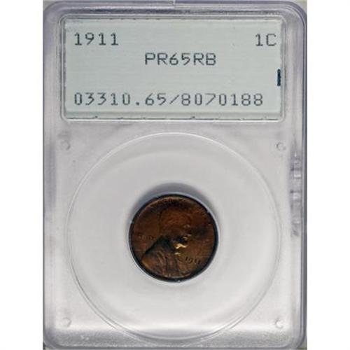 <B>1911 1C PR65 Red and Brown PCGS.</B></I> Swaths of red and brown alternate on each side of this Gem piece, certified in a first-generation small-size PCGS holder. The fully struck details and beveled rims confirm the proof status.<BR><BR><B>Coin Engraver:</B> Victor D. Brenner<BR><BR><b>Shipping:</b> Coins & Currency (<a target="_blank" href="http://www.heritageauctions.com/common/shipping.php">view shipping information</a>)