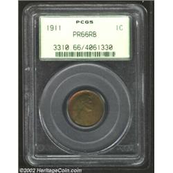 1911 1C PR66 Red and Brown PCGS. Uniform brown at its center, with rosy red highlights toward its periphery, this is a beautiful example of a rare Lincoln Cent in the ultimate condition, and in as high a grade as PCGS has assigned thus far. Population: 11 in 66, 0 finer (10/02). Important notice: We expect to be auctioning lots at the rate of 200-250 per hour. Sometimes eBay Premier live bid software cannot keep up with that pace, so we strongly recommend that you place a realistic proxy bid now as insurance to avoid disappointment. Also please note that all Heritage/CAA lots purchased through eBay Premier carry a 20% Buyer's Premium. Please make sure you read the Terms and Conditions.