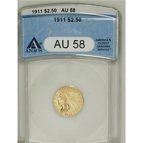 <B>1911 $2 1/2 AU58 ANACS.</B></I> NGC Census: (867/6566). PCGS Population (752/3303). Mintage: 704,000. Numismedia Wsl. Price: $225. (#7942)<BR><BR><b>Shipping:</b> Coins & Currency (<a target="_blank" href="http://www.heritageauctions.com/common/shipping.php">view shipping information</a>)