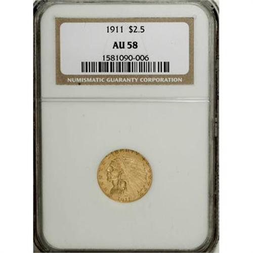 <B>1911 $2 1/2 AU58 NGC.</B></I> NGC Census: (939/6808). PCGS Population (768/3409). Mintage: 704,000. Numismedia Wsl. Price for NGC/PCGS coin in AU58: $231. (#7942)<BR><BR><B>Coin Engraver:</B> Bela Lyon Pratt<BR><BR><b>Shipping:</b> Coins & Currency (<a target="_blank" href="http://www.heritageauctions.com/common/shipping.php">view shipping information</a>)