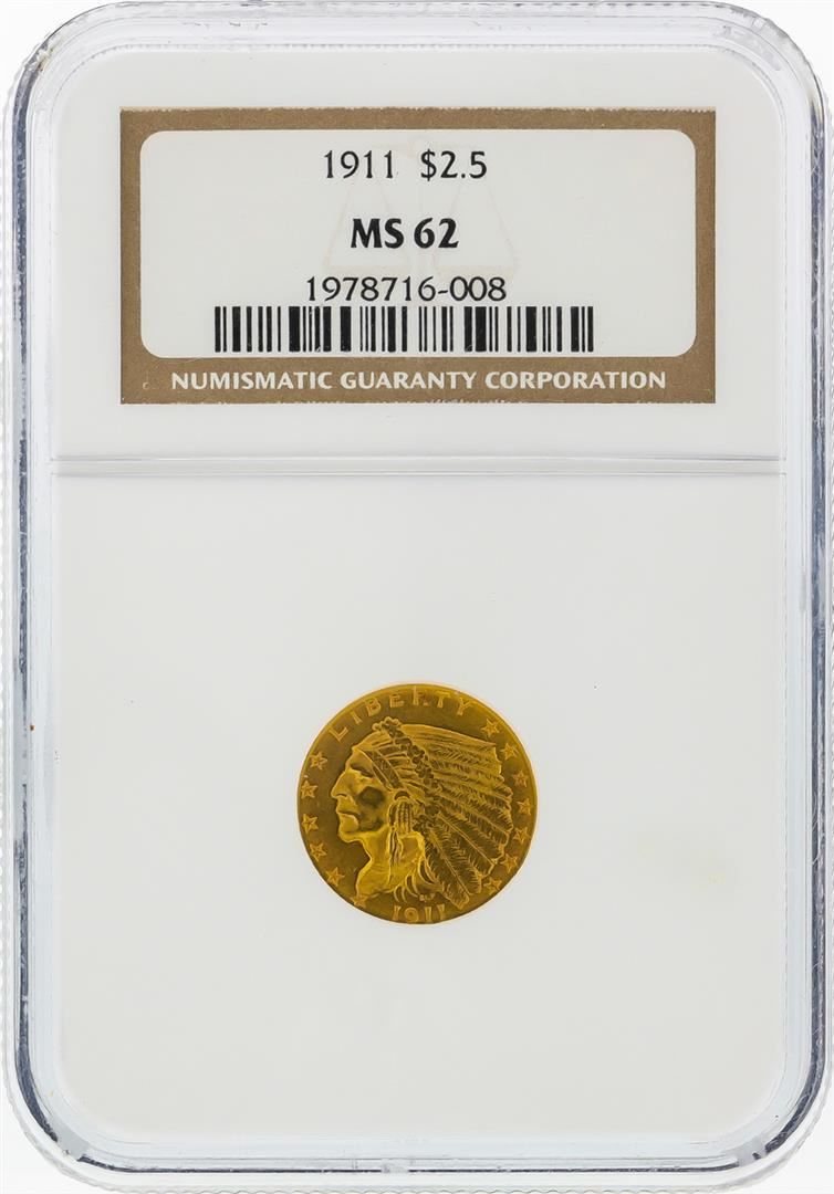 One 1911 $2.5 Indian Head Gold Coin NGC Graded MS62. NGC Certified.